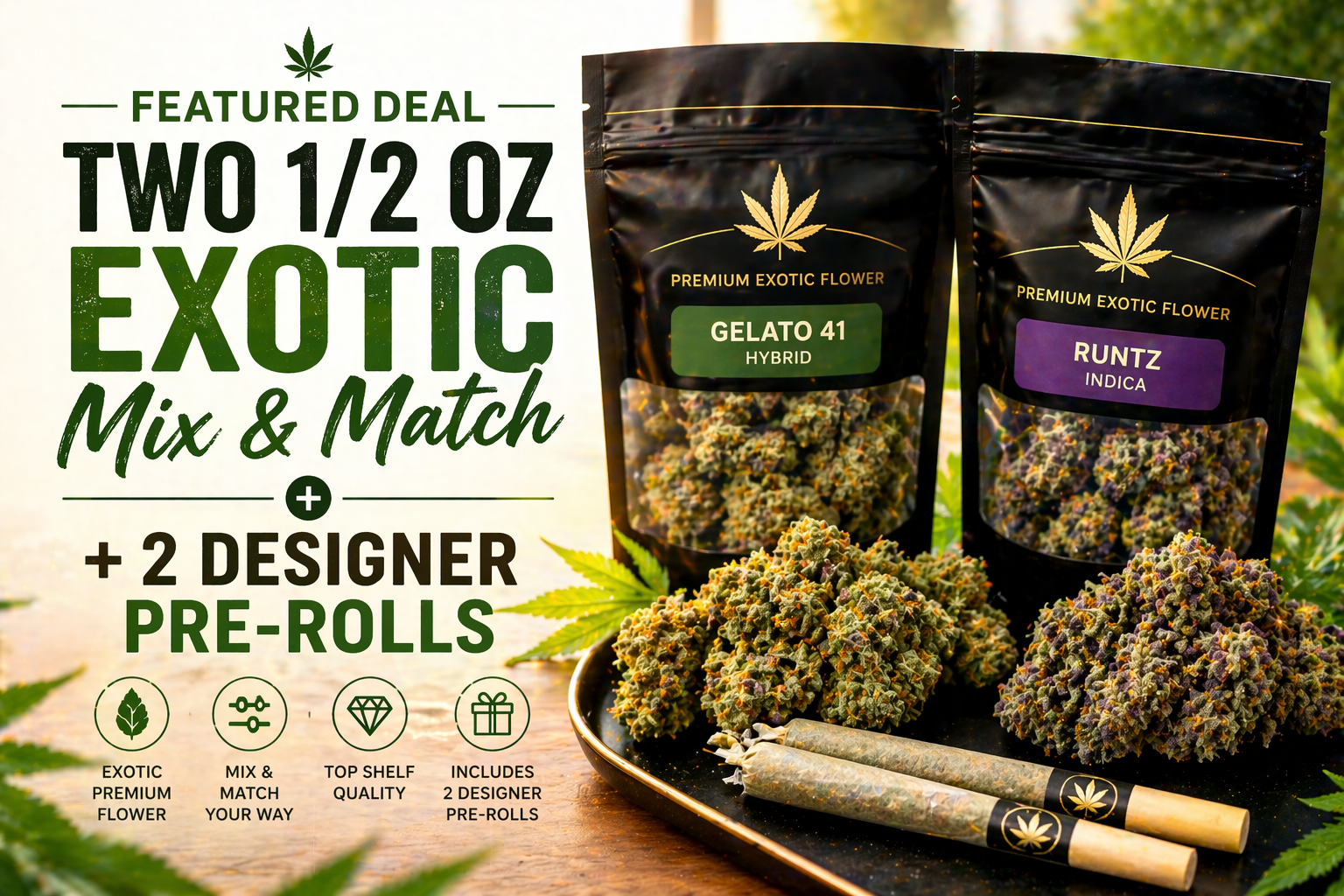 🌿 Featured Deal: Two 1/2 Oz Exotic Mix & Match + 2 Designer Pre-Rolls